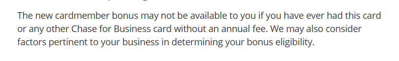 The signup bonus may not be available to you if you have ever had any Chase for Business card with no annual fee